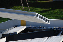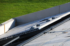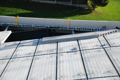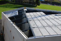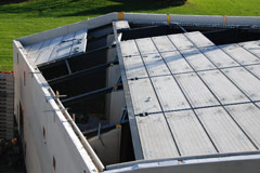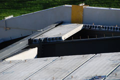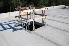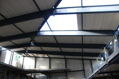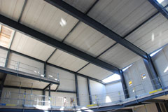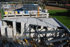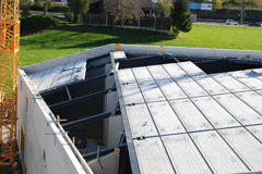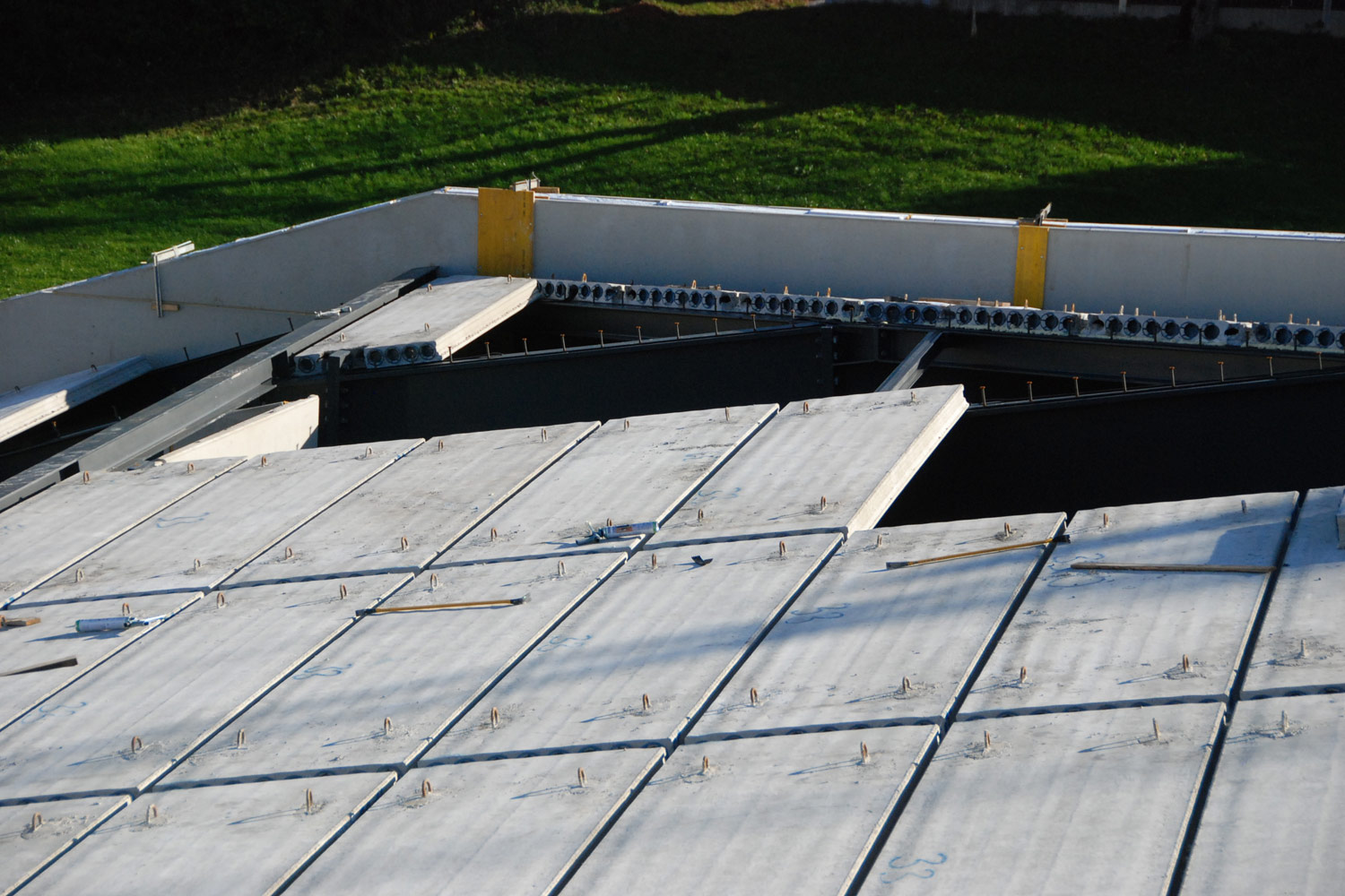 Hier wurden Hohlplatten mit 16 cm Stärke auf einer Stahlkonstruktion aufgelagert. Die Dachfläche misst etwa 1300 m² und besteht aus 6 unterschiedlich geneigten Ebenen.